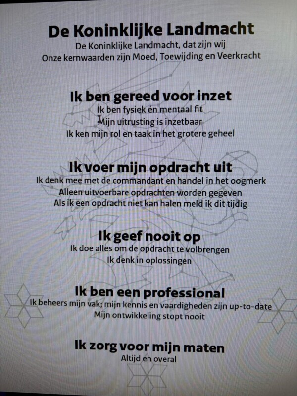 Afgelopen maandag 8 september verduidelijkte C-Las zijn Command Message voor zijn ondercommandanten en Regiments- en Korpscommandanten. Vorig jaar beloofde generaal Swillens voor al het personeel een tag te vervaardigen met daarop de kernboodschap: zijn Command message. Alle regiments- en Korpscommandanten ontvingen voor hun regiment/korps een speciaal ingelijst exemplaar. Voor ons regiment is de achterzijde bedrukt met onze beeltenis en onze spreuk: BONUM NON ABSURDUM.