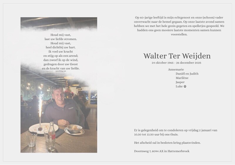 Walter mocht slechts 60 jaar worden en laat zijn vrouw Annemarie en zijn kinderen Daniël, Judith, Marilène en Jasper achter. Onze gedachten gaan uit naar hen, de familie en vrienden die dit grote verlies moeten dragen.